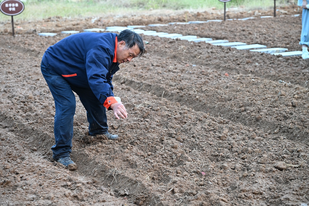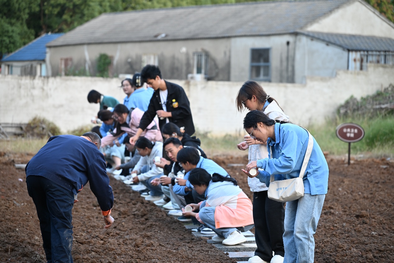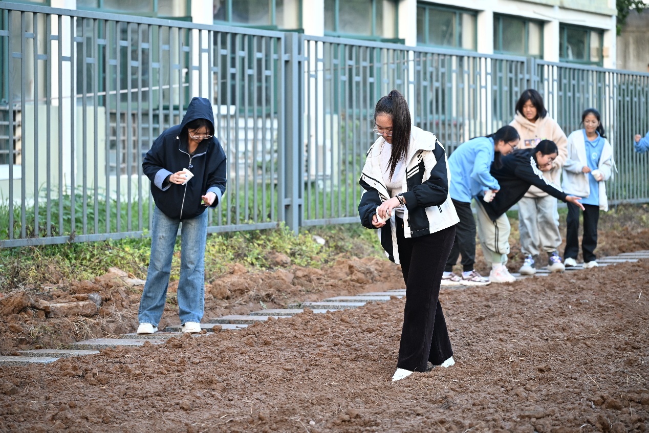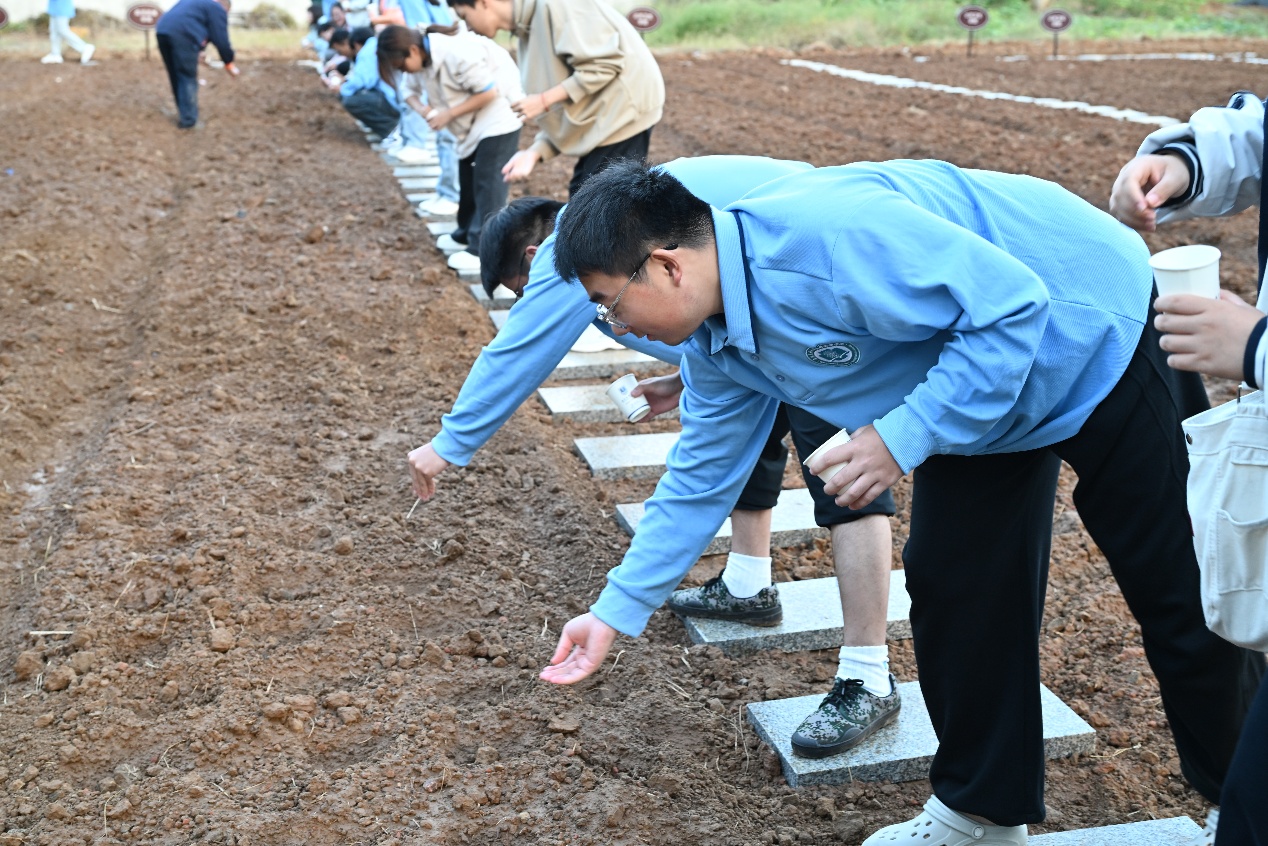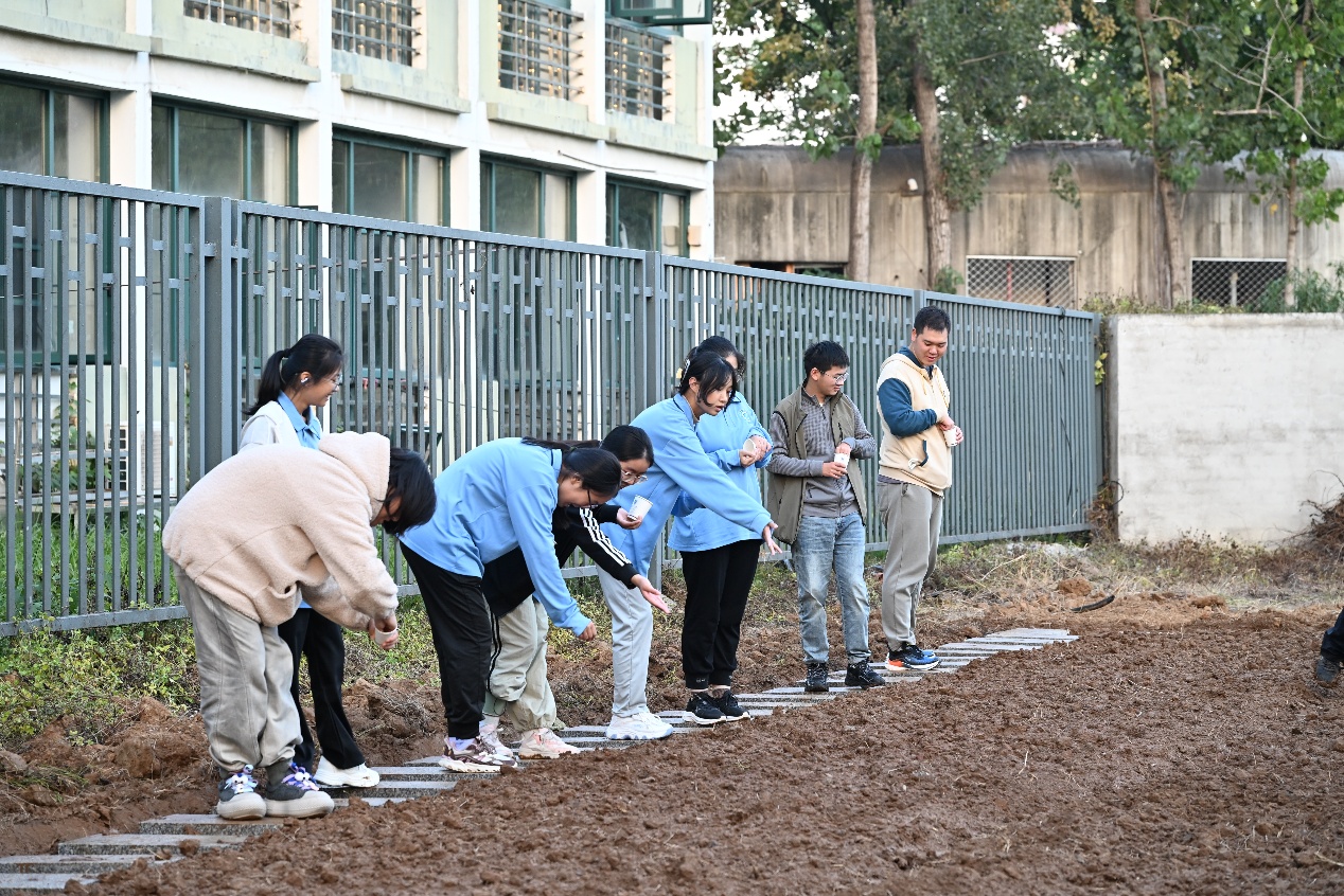 负责老师宣布活动开始后,两位职工为学生分发大白菜的种子并仔细传授播种技巧——开浅沟、撒种子、盖薄土、轻轻压、浇透水。接着,学生卷起裤脚,撸起衣袖,满怀期待走进实验田,对着学院事先准备好的浅土沟,精准撒入7-8粒种子并盖上薄土轻轻按压,期待着种子的健康成长。然后,负责任的两位职工再为实验田浇水。